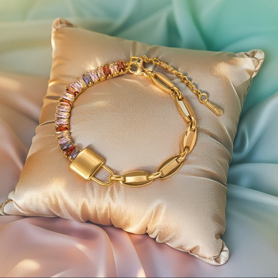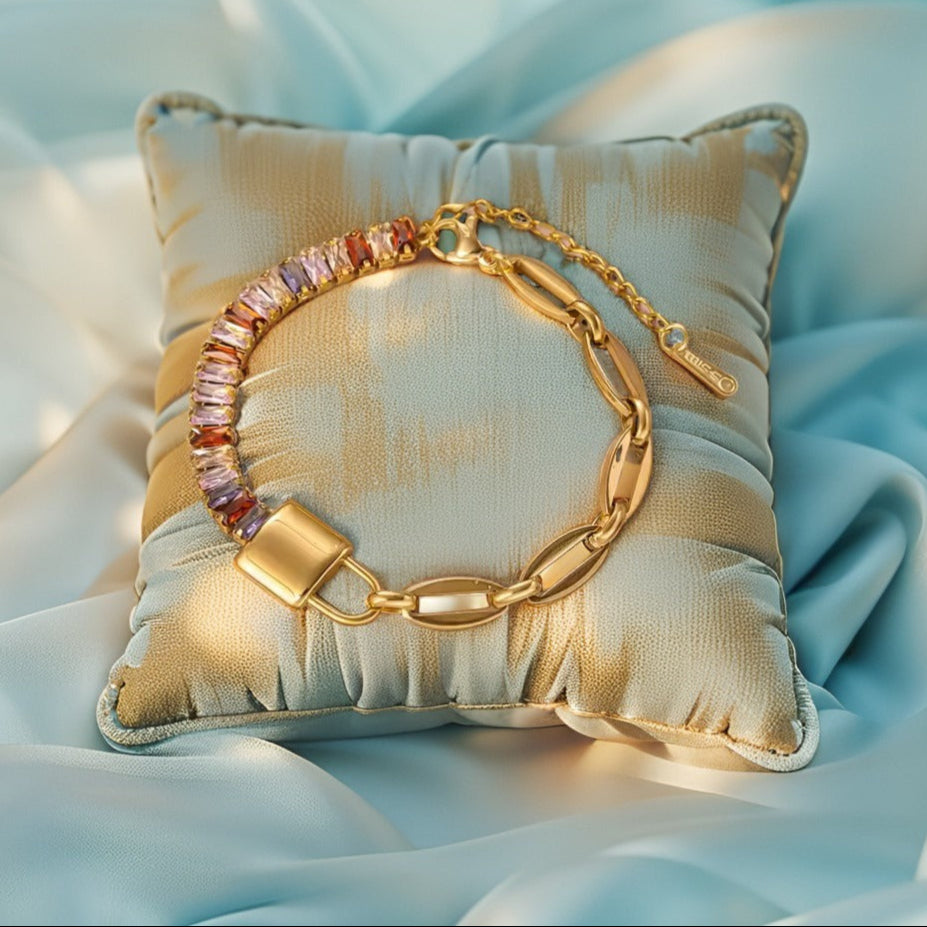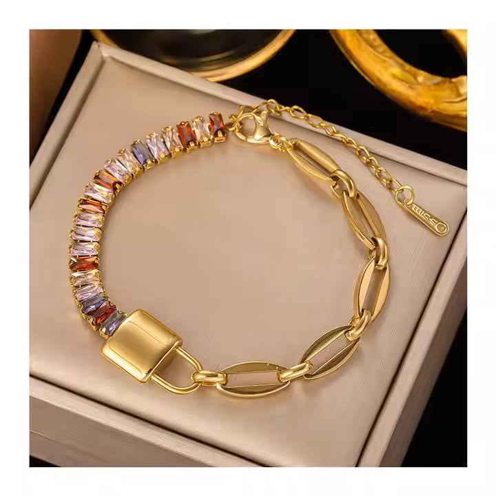 Delicate yet bold, this charm bracelet features a stunning mix of CZ zircon lock charm, all crafted on a sleek stainless steel chain with a luxurious 18K gold plating. Designed to be waterproof and tarnish-resistant, it's made for everyday elegance.